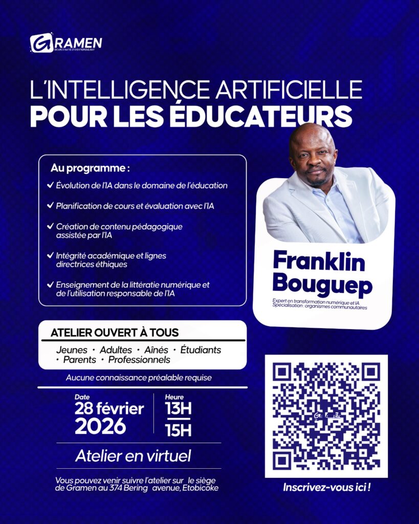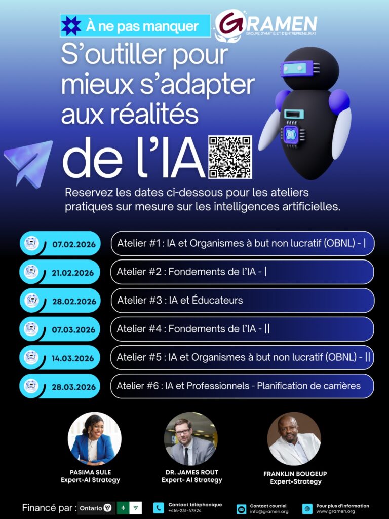 À l’ère du numérique, comprendre l’intelligence artificielle n’est plus une option, c’est une opportunité. Une opportunité d’apprendre, de s’adapter et de mieux s’intégrer dans un monde du travail en pleine évolution. À travers ce programme, GRAMEN propose une série d’ateliers pratiques pour initier les immigrants francophones du Grand Toronto aux bases de l’intelligence artificielle et aux technologies émergentes, de manière simple, concrète et accessible. Veuillez s’il vous plait prendre connaissance des différents ateliers ci-dessous avant de vous inscrire. Vous pouvez vous inscrire gratuitement à un ou plusieurs ateliers. Pour vous inscrire cliquez sur le bouton INSCRIVEZ-VOUS